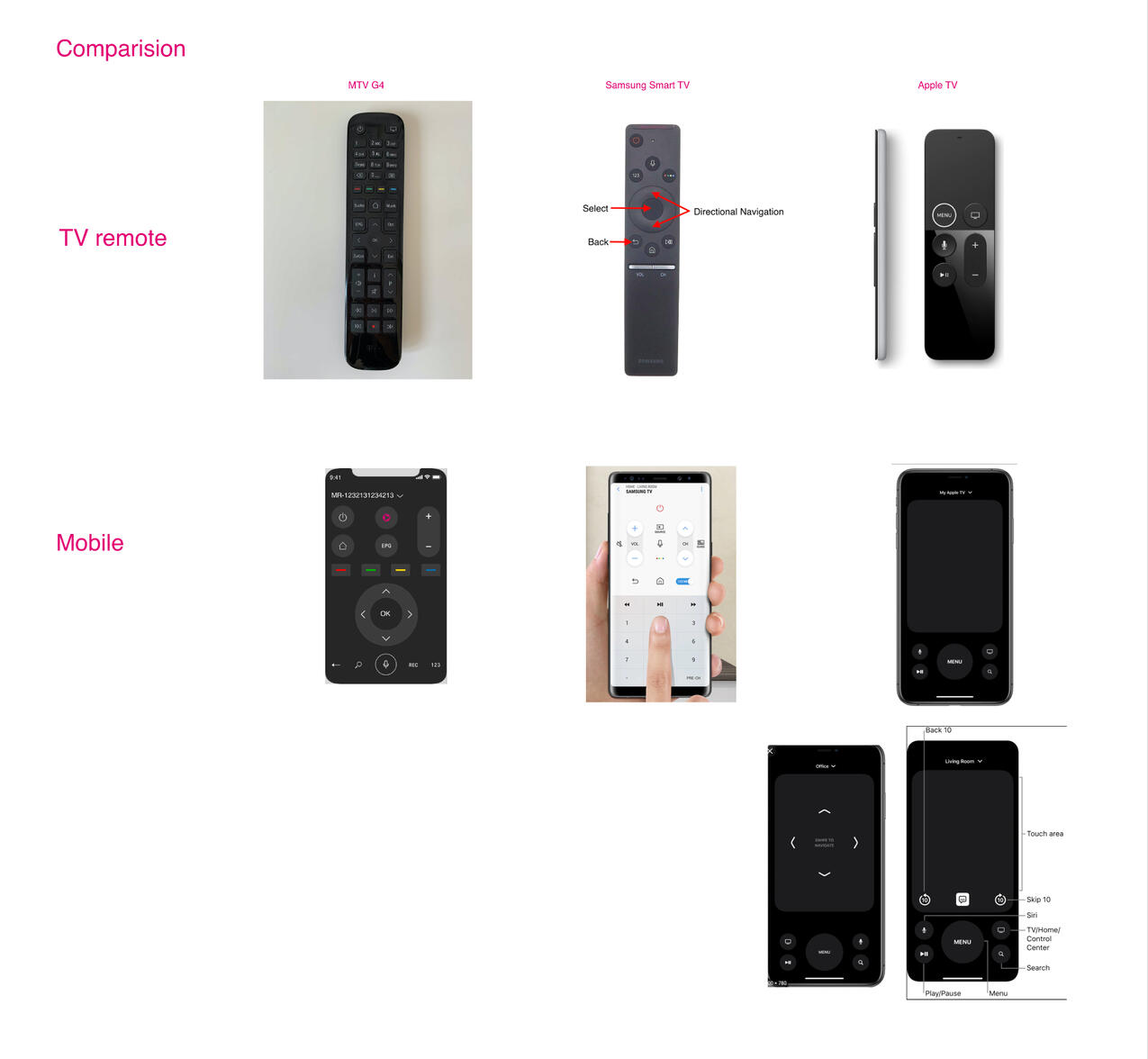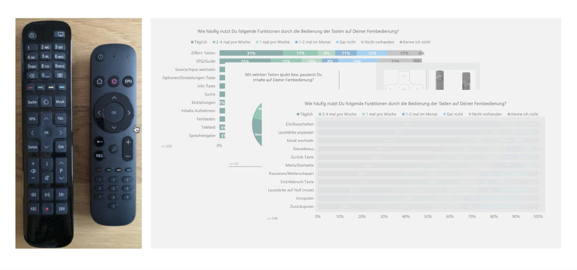 Usability studies reportUsers were surveyed on to get a general understanding of how they use the remote control to access the TV content. Based on quantitative results, users stated they frequently use play/pause, fast forward, rewind and mute buttons on a daily basis as well as those of less frequent usage.Physical remote controlUsers are familiar with the positioning of frequent used buttons. Therefore the remote control is used as a guide for new buttons placement.